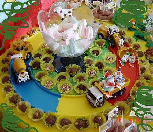 Pormenor da mesa da comida, uma rotunda com carros das obras a transportar doces.