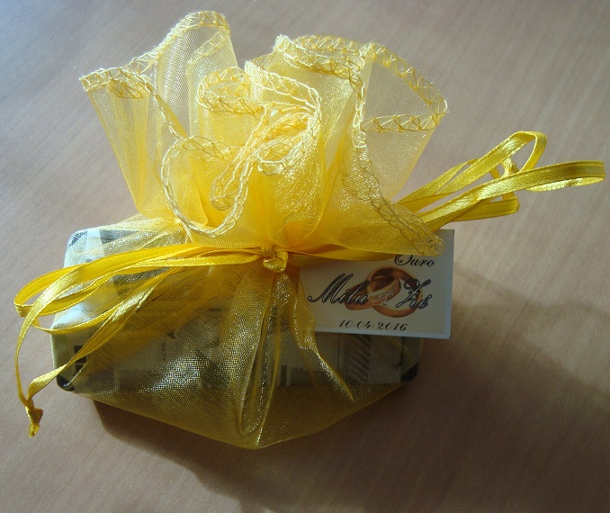 Saquinhos/trouxas de organza douradas, bordaux e brancas, com 3 chocolates formando um puzle com uma foto do casamento.